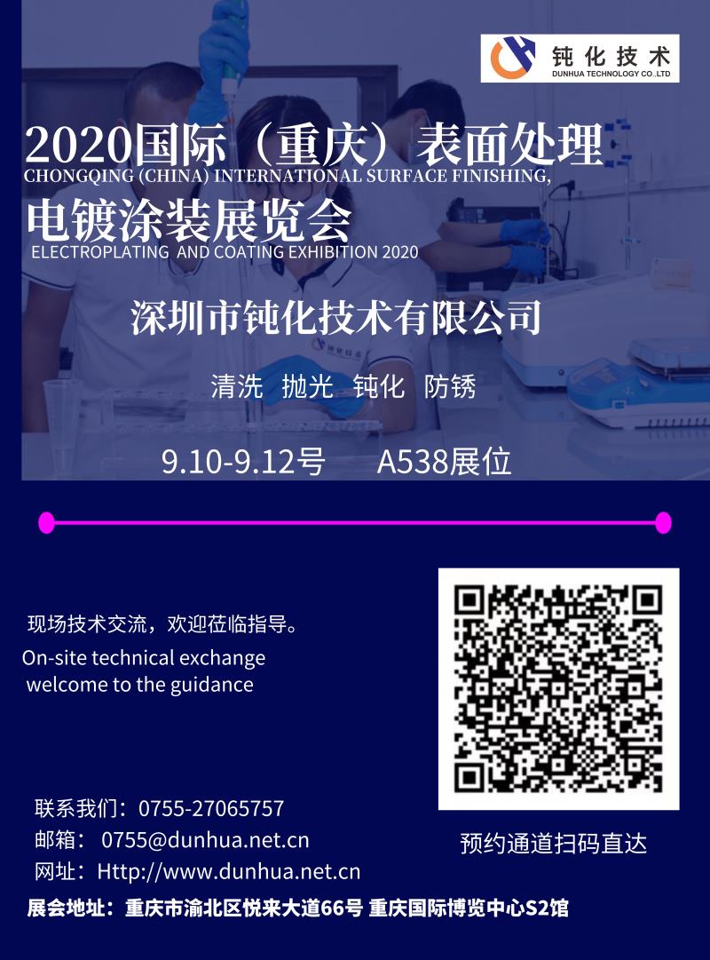 非常感謝您對(duì)深圳市鈍化技術(shù)有限公司長(zhǎng)期以來(lái)的大力支持,我公司將參加2020國(guó)際(重慶)表面處理電鍍涂裝展覽會(huì),屆時(shí)將向您展示我公司高新表面處理技術(shù),為您提供全方位的解決方案。我們?cè)诖苏嬲\(chéng)的期盼您的參觀,恭候您的到來(lái)。