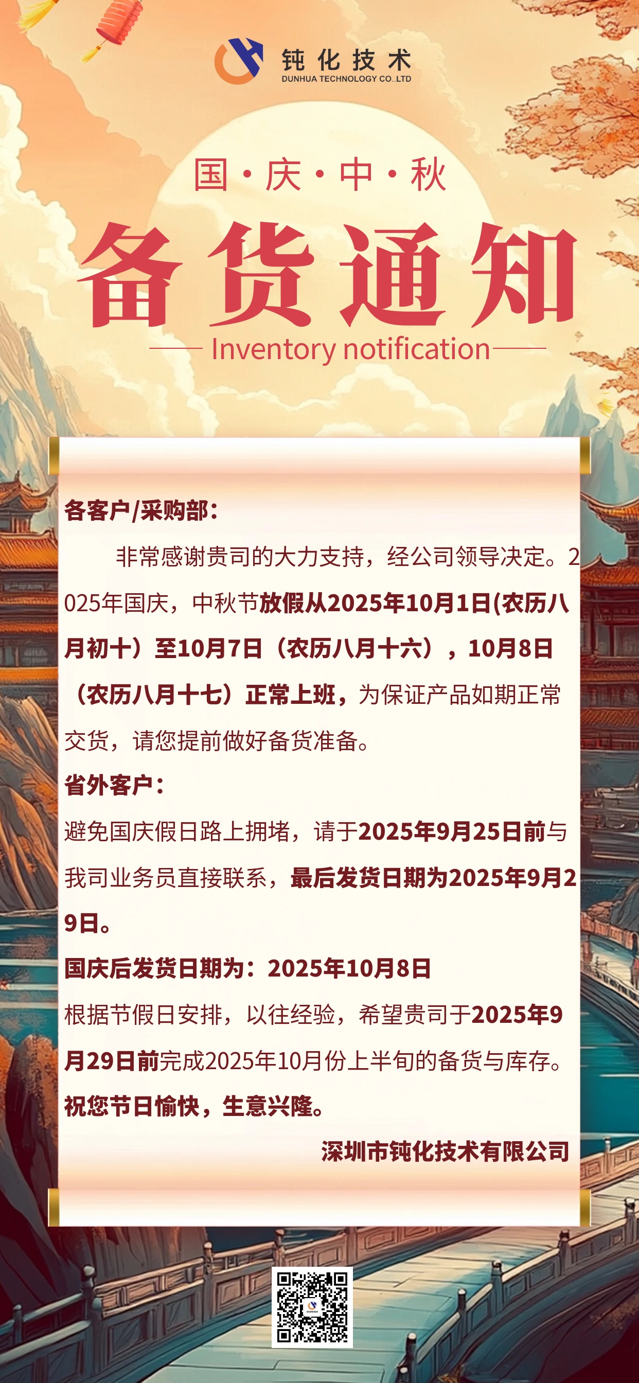 秋風(fēng)送爽,丹桂飄香,我們即將迎來祖國的華誕與中秋團(tuán)圓的美好時(shí)刻!現(xiàn)我司放假安排如下,為保證產(chǎn)品如期正常交貨,請(qǐng)您提前做好備貨準(zhǔn)備。