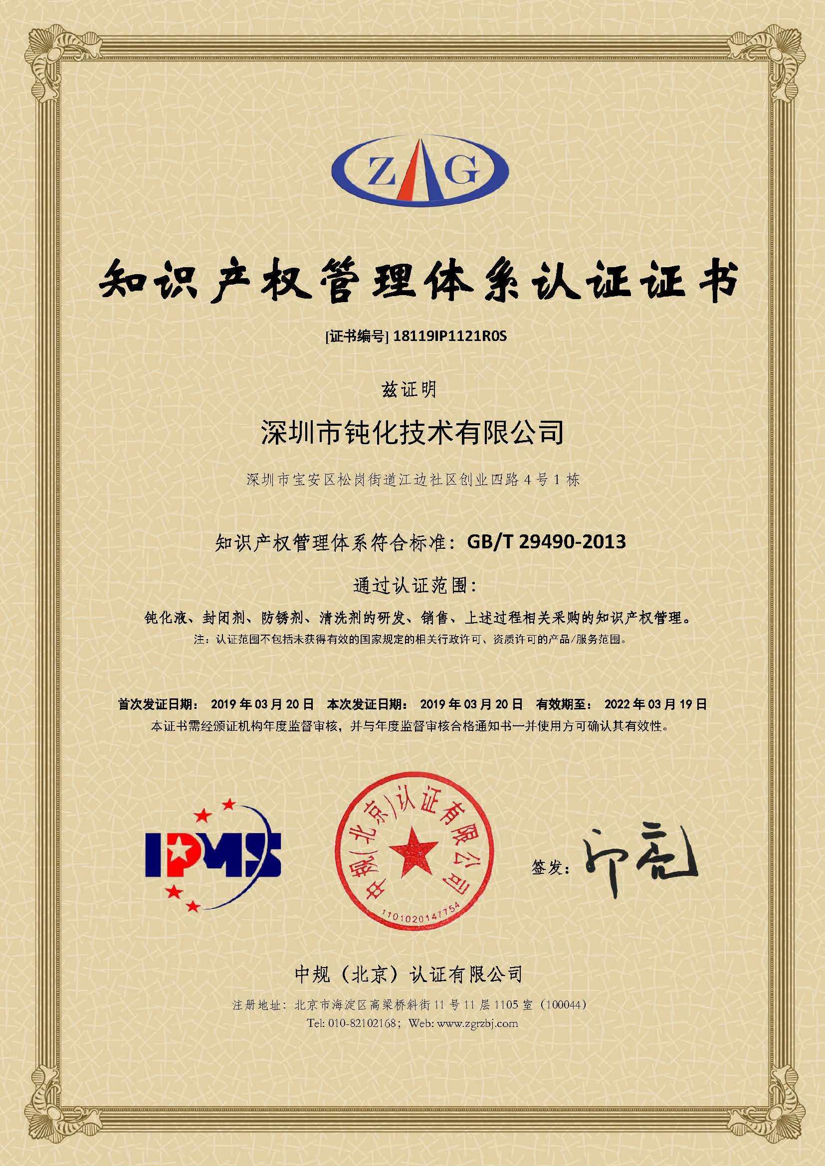 深圳市鈍化技術(shù)有限公司近日通過鈍化人的協(xié)作與努力,順利通過了知識(shí)產(chǎn)權(quán)管理體系認(rèn)證,并收到中規(guī)(北京)認(rèn)證有限公司頒發(fā)的《知識(shí)產(chǎn)權(quán)管理體系認(rèn)證證書》,認(rèn)證鈍化技術(shù)知識(shí)產(chǎn)權(quán)管理體系符合標(biāo)準(zhǔn):GB/T 29490-2013,發(fā)證日期2019年03月20日。通過認(rèn)證范圍為鈍化液、封閉劑、防銹劑、清洗劑的研發(fā)、銷售,上述過程相關(guān)采購(gòu)的知識(shí)產(chǎn)權(quán)管理。