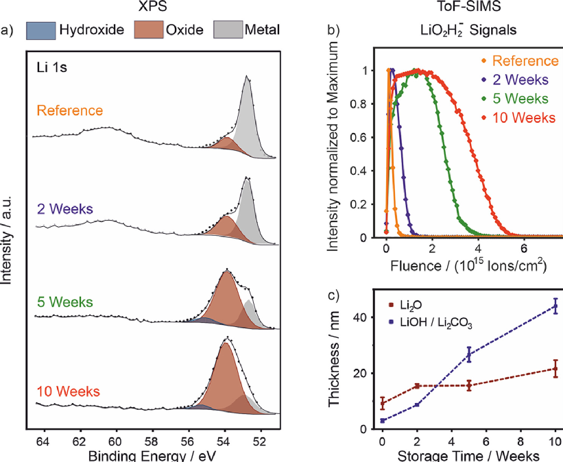 圖 1、使用(a)XPS濺射后(1 kV濺射3分鐘、2 kV 8分鐘和4 kV濺射30分鐘),在手套箱密閉塑料盒中存放1到10周的鋰箔表面分析結(jié)果,和(b)ToF-SIMS深度分析結(jié)果。(c)鈍化層厚度隨存儲(chǔ)時(shí)間的變化。
