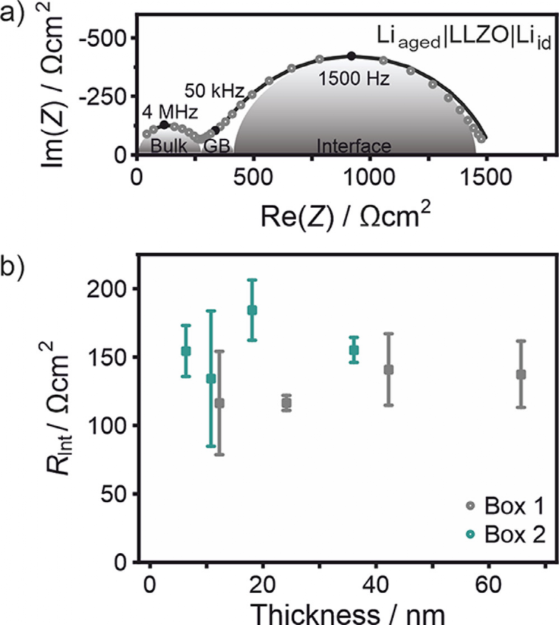 圖 2、在以LLZO為 SE的對(duì)稱(chēng)電池阻抗譜結(jié)果。(a)奈奎斯特圖。(b)鋰箔在手套箱1(p(H2O和O2)/p約為1 ppm,變化高達(dá)10 ppm)或手套箱2(p(H2O和O2 )/p<0.1 ppm,并且變化僅1 ppm)中存儲(chǔ)十周后的界面電阻。