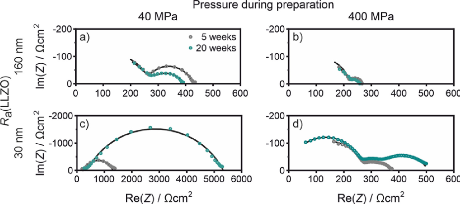 圖3a顯示,不同存儲(chǔ)時(shí)間下的阻抗沒(méi)有顯著差異。將壓力增加到400 MPa(圖3b)甚至消除了之前存在的微小差異,表明所施加的壓力具有很強(qiáng)的影響。在較低粗糙度和40 MPa的壓力下,較厚的鈍化層具有更高的界面電阻。在較高的壓力下,差異也很明顯。這表明較低粗糙度下,鋰箔無(wú)法通過(guò)變形使鈍化層破裂,改善界面接觸,因此鈍化層厚度對(duì)界面阻抗的影響較大(圖4)。實(shí)驗(yàn)表明,SE的粗糙度和施加壓力對(duì)與LLZO接觸的鋰金屬箔界面電阻起著重要作用。