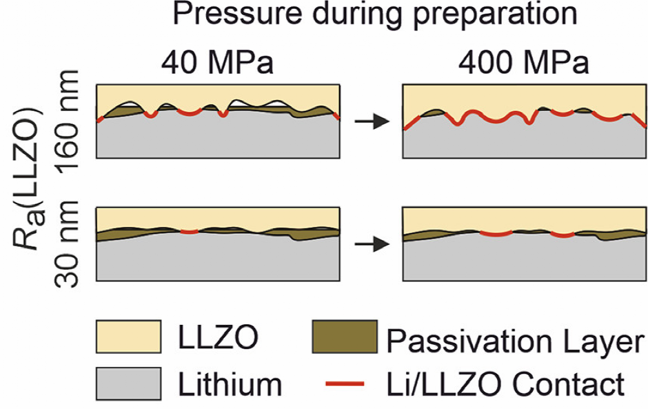 圖 4、用不同的LLZO顆粒粗糙度和壓力測(cè)量的Li|LLZO界面示意圖。