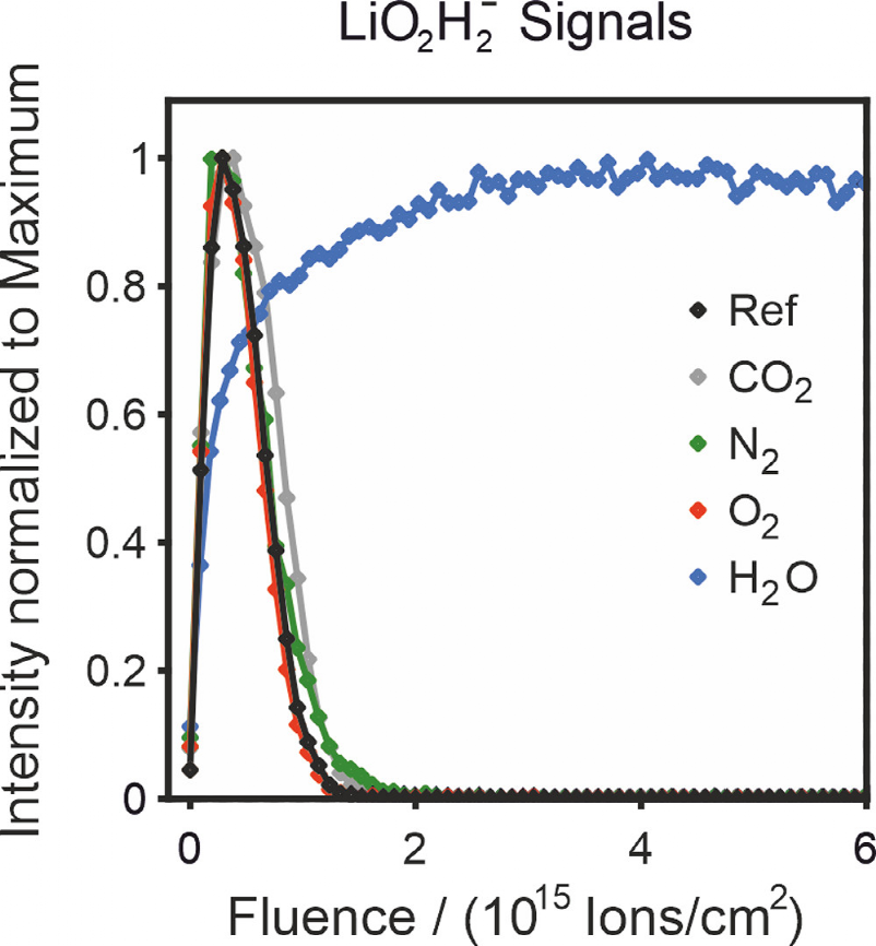圖 5、暴露于干燥N2、O2和CO2以及含H2O的Ar中22小時(shí)的鋰箔ToF-SIMS深度分布圖。