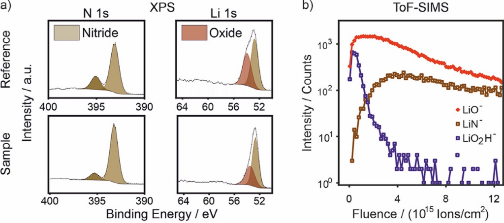 ToF-SIMS深度分布如圖6b所示,近表面區(qū)域不包含Li3N,因?yàn)殚_(kāi)始的LiN–信號(hào)強(qiáng)度非常低,而氧化物的強(qiáng)度和氫氧化物相關(guān)信號(hào)占主導(dǎo)地位。隨著濺射時(shí)間的延長(zhǎng),LiN–強(qiáng)度會(huì)增加并變得幾乎恒定,表明樣品完全轉(zhuǎn)化為L(zhǎng)i3N。完全轉(zhuǎn)化表明鋰和氮的反應(yīng)在手套箱氣氛下不是自限性的。因此,Li3N很可能不會(huì)形成覆蓋層。