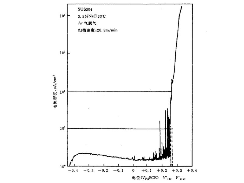 (3) 點蝕通常在某一臨界電位以上發(fā)生,該電位稱作點蝕電位或擊破電位,又在某一電位以下停止,而這一電位稱作保護電位或再鈍化電位。當電位大于點蝕電位時,點蝕迅速發(fā)生、發(fā)展;電位在點蝕電位與保護電位之間時,已發(fā)生的點蝕繼續(xù)發(fā)展,但不產(chǎn)生新的蝕孔;電位在保護電位以下時,點蝕不發(fā)生,即不會產(chǎn)生新的孔蝕,已有的蝕孔將被鈍化不再發(fā)展。